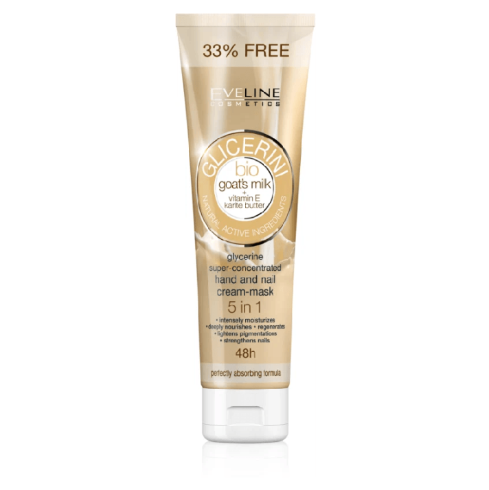 Crema Eveline Cosmetics Glycerine pentru mâini şi unghii cu lapte de capră este un produs cosmetic bogat în ingrediente naturale, creat pentru a oferi o îngrijire completă şi eficientă. Formula sa inovatoare conţine o combinaţie de ingrediente preţioase, precum lapte de capră bio, vitamina E, unt de shea, colagen, ulei de germeni de grâu, glicerină, D-Panthenol şi alantoină.