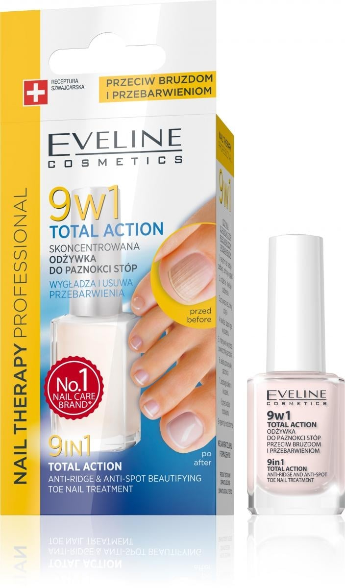 Tratamentul 9în1 Total Action de la Eveline Cosmetics este soluția ideală pentru unghiile de la picioare subțiri, casante sau deteriorate. Formula sa avansată combină ingrediente active care pătrund în profunzimea unghiei, oferindu-i regenerare și protecție intensivă.
